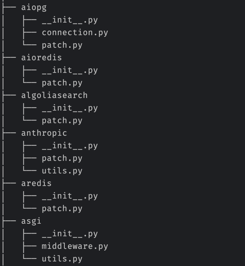 Patch 모듈을 담은 ddtrace/contrib/ 디렉터리를 보면 다음과 같은 구조로 구성되어 있다. 대부분 __init__. py와 patch.py 파일을 가지고 있다. 설령 patch.py 파일이 없다고 하더라도, 어딘가에는 patch 함수가 들어있다.