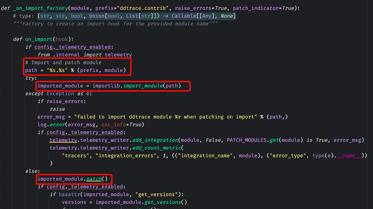 Python에서의 "Monkey Patch"는 런타임 시 객체나 모듈의 행위를 동적으로 변경하는 기법이다. 이는 주로 코드의 동작을 수정하거나 확장하기 위해 사용된다. Monkey Patch는 개발자가 직접 작성하지 않은 외부 라이브러리나 프레임워크의 기능을 수정하거나 확장해야 할 때 유용하다. 데이터독이 자신이 개발하지 않은 라이브러리에 Tracing 기능을 붙일 수 있는 이유도 바로 이러한 Monkey Patch 기법을 사용했기 때문이다.