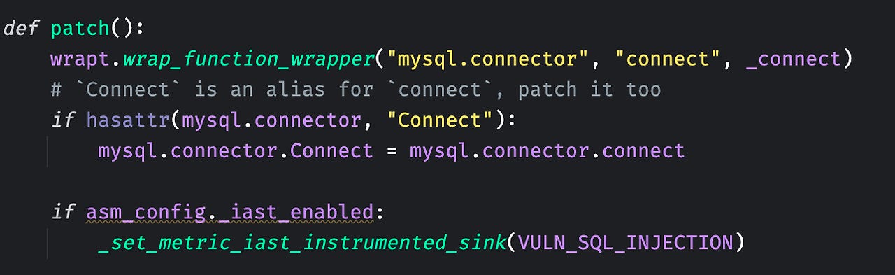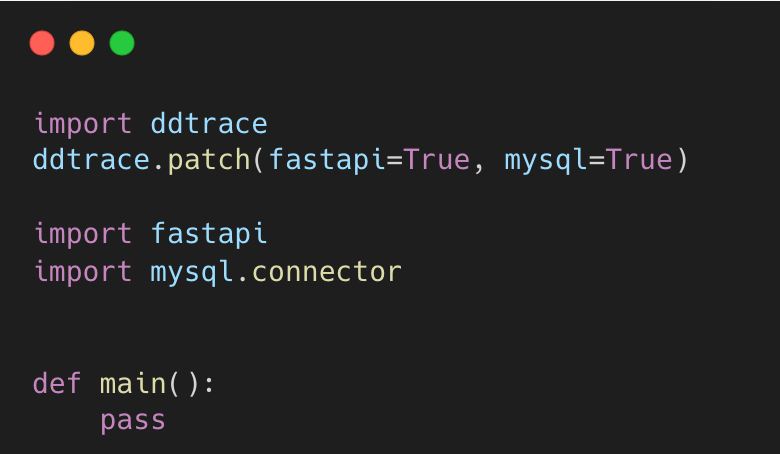 그러면 patch 함수를 한번 확인해 보자. 예컨대, fastapi와 mysql을 사용한다고 가정해 보자. 그러면 ddtrace를 통해서 다음과 같이 fastapi와 mysql 모듈을 patch 할 수 있다.