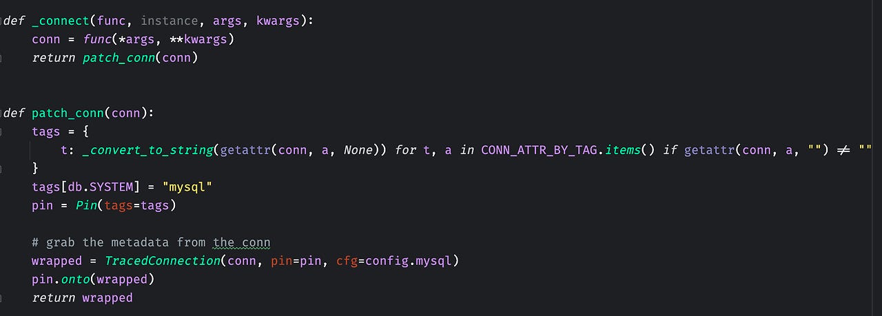 _connect 함수를 보면, 동일하게 원래 함수가 func 인자로 넘어온다. connection을 만들 때는 mysql.connector.connect 함수를 사용해서 만들고, 해당 conn 객체를 통해서 Tracing을 위한 작업을 수행하기 위해 TracedConnection 인스턴스를 생성한다.