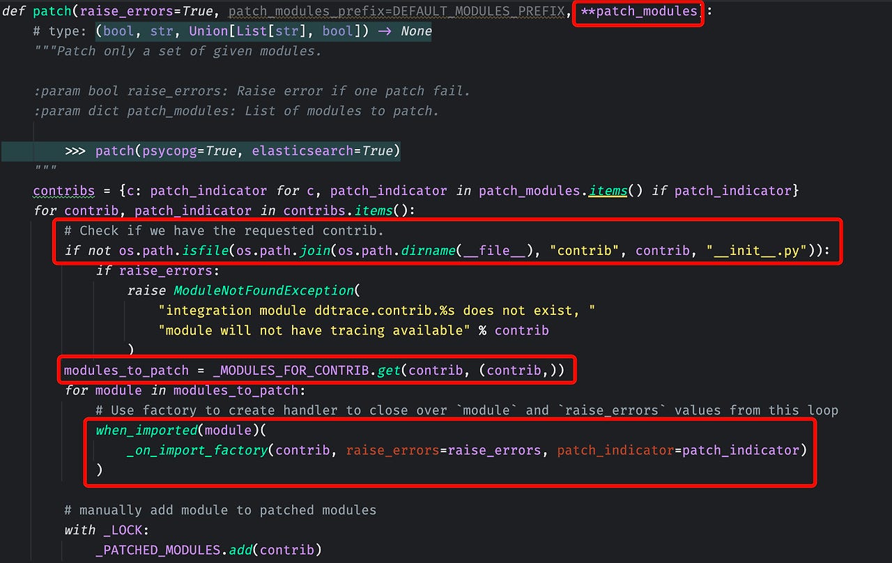 patch() 함수를 보면, 먼저 패치할 모듈의 이름을 key=value 형태로 받아온다. 그 후에는 해당 모듈을 데이터독이 지원하는지 확인한다. 확인하는 방법은 contrib/ 하위에 해당 모듈에 대한 코드를 찾는 것이다. 만약 코드가 없으면, 아직 지원하지 않는 것이다.