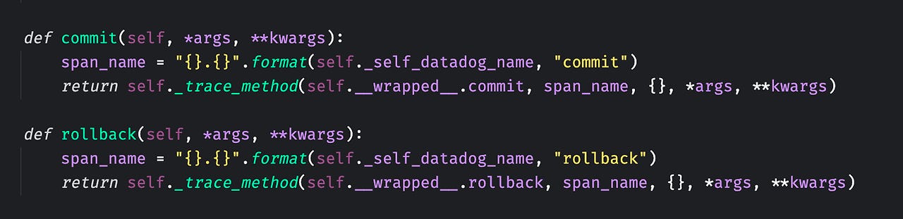 사용자는 conn.commit, conn.rollback 등과 같은 함수를 호출할 때, MySQL 모듈을 사용한다고 생각할 수 있지만, 실제로는 TracedConnection 객체의 commit, rollback 함수가 수행된다. 그 안에서 원래 함수였던 __wrapped__. commit, __wrapped__. rollback 함수가 수행되는 것이다.