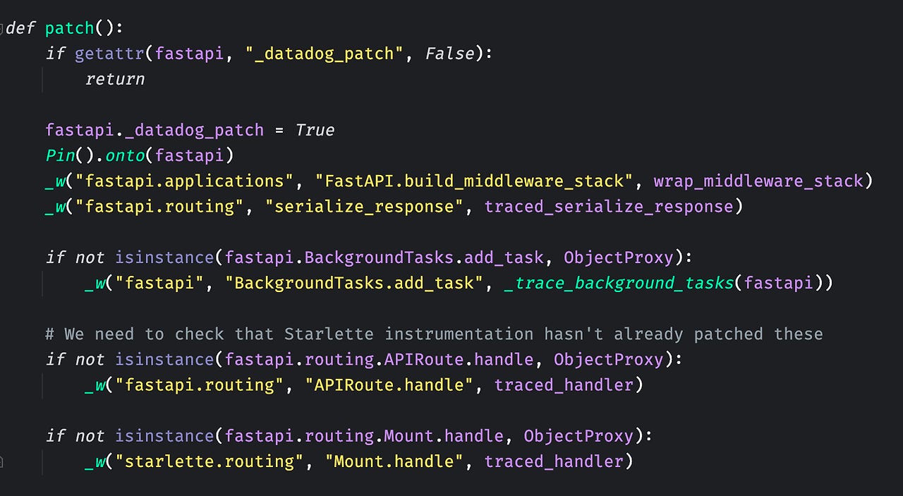 다음은 fastapi에 대한 patch 함수이다. ddtrace는 fastapi 프레임워크 구조를 tracing 하기 위해서 middleware, response, backgroundTasks 등과 요소를 patch 한다. _w 함수는 wrap_function_wrapper 함수인데, 기존의 함수를 Wrapping 하여 다른 함수가 되도록 만들어준다.