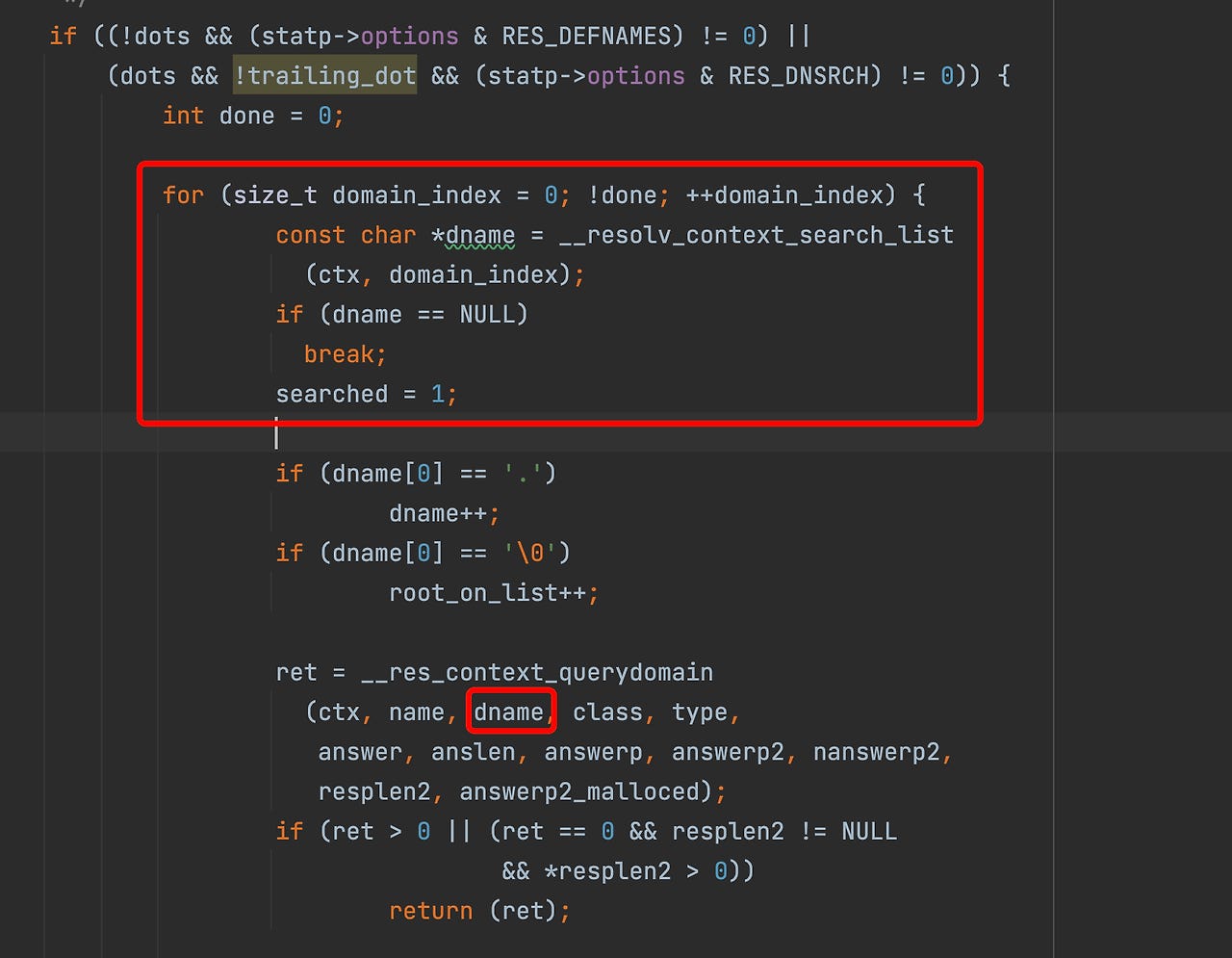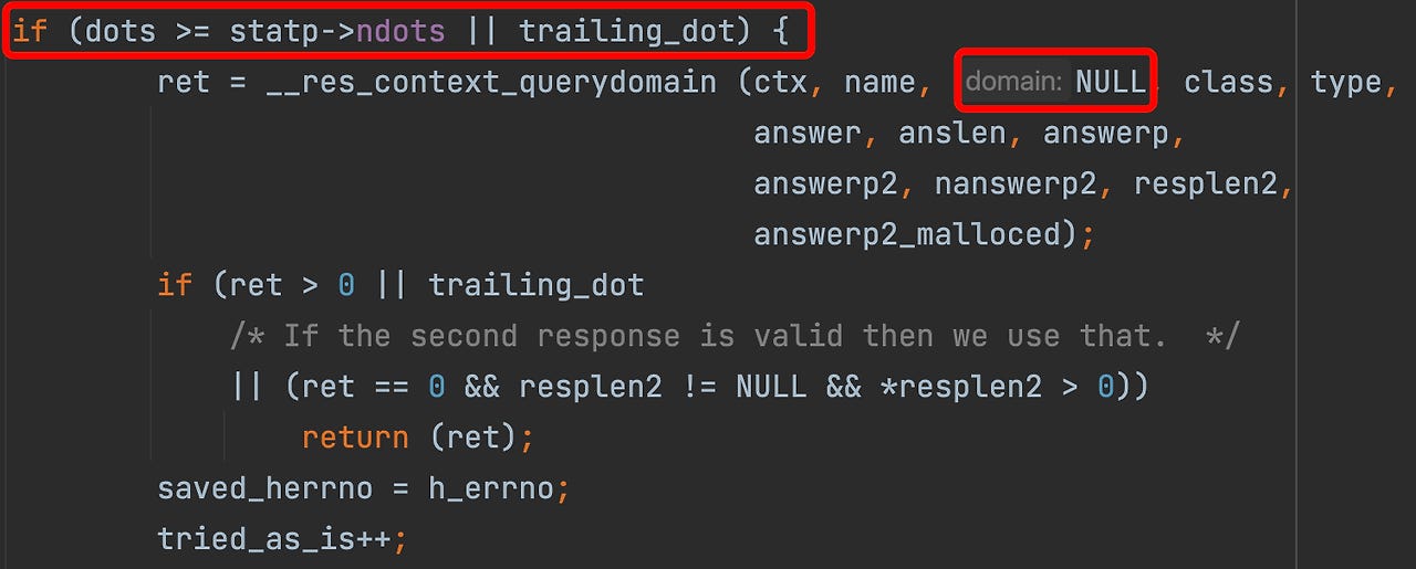 resolv/res_query.c 파일에서 __res_context_search() 함수를 확인해 보면, 다음과 같이 조건이 absolute query에 대한 조건이 걸려있다. 만약 질의한 도메인의 점 개수가 ndots 값 이상이거나 끝에 점(.) 이 있으면 해당 이름으로 __res_context_querydomain 함수를 호출할 때 domain 값을 NULL로 지정한다.