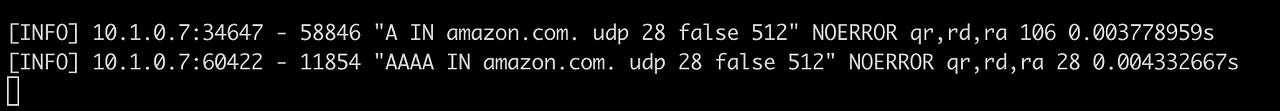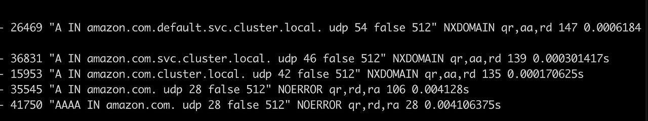 설정을 마치고, 파드 내에서 amazon.com을 질의했다. 그 결과 위에서 언급했던 것과 동일하게 4개의 레코드가 질의되었다. (마지막 AAAA는 제와)