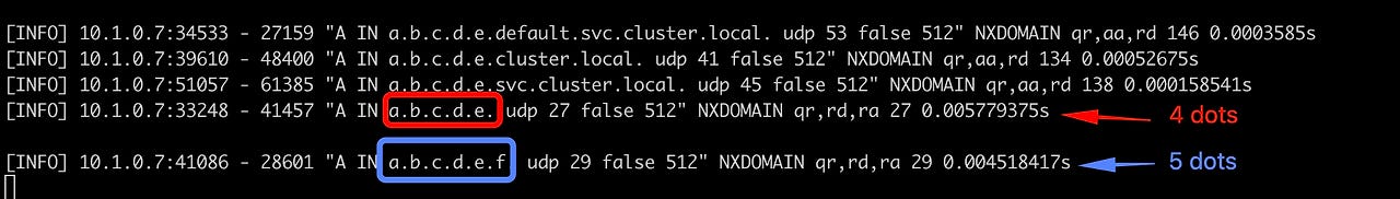 위 설정에서처럼 ndots: 5 인 상태에서, 5개 이상의 점을 붙이면 다음과 같이 질의가 1번만 발생한다. 4개 점을 붙인 도메인을 질의했을 때랑 비교해 보면 정확하게 알 수 있다.